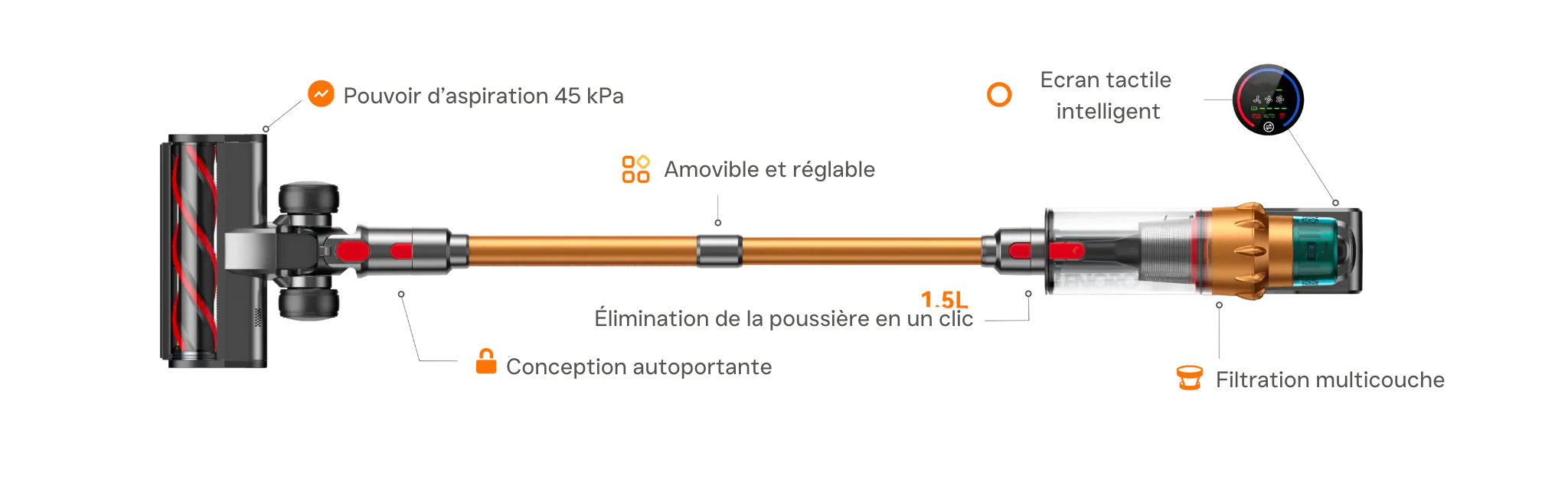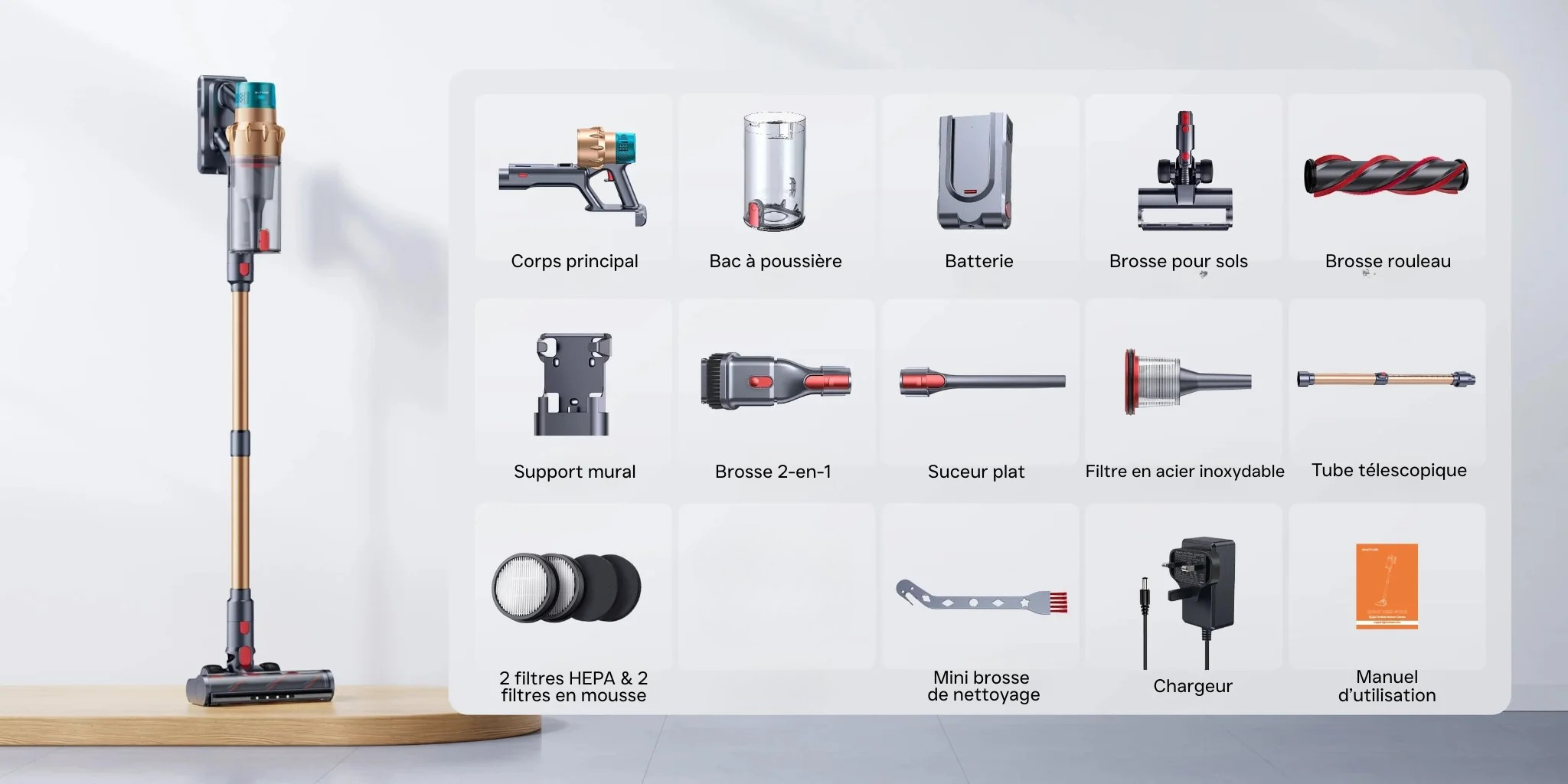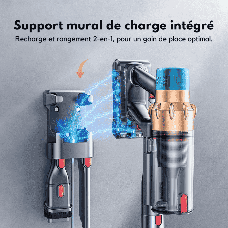 Gardez votre intérieur organisé et sans encombrement grâce au support mural 2-en-1 du V18. Cette solution pratique vous permet de recharger votre aspirateur tout en rangeant soigneusement tous ses accessoires au même endroit.